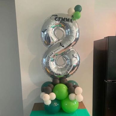 Our single number balloon bouquet can be color matched to event with added details including foil balloons to match your theme. Customize name included.